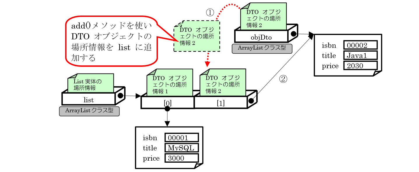 1回目のループと同じように、図の①でDTOオブジェクトの場所情報をコピーし、その結果、②のように同じオブジェクトを参照するようになります。なお、1回目のループで要素[0]にデータが入っているため、2回目のループでは要素[1]にデータが格納されます。