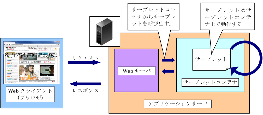 アプリケーションサーバとは、Javaプログラムで記述されたサーブレットを呼び出し、実行する環境を持ったWebサーバのことです。