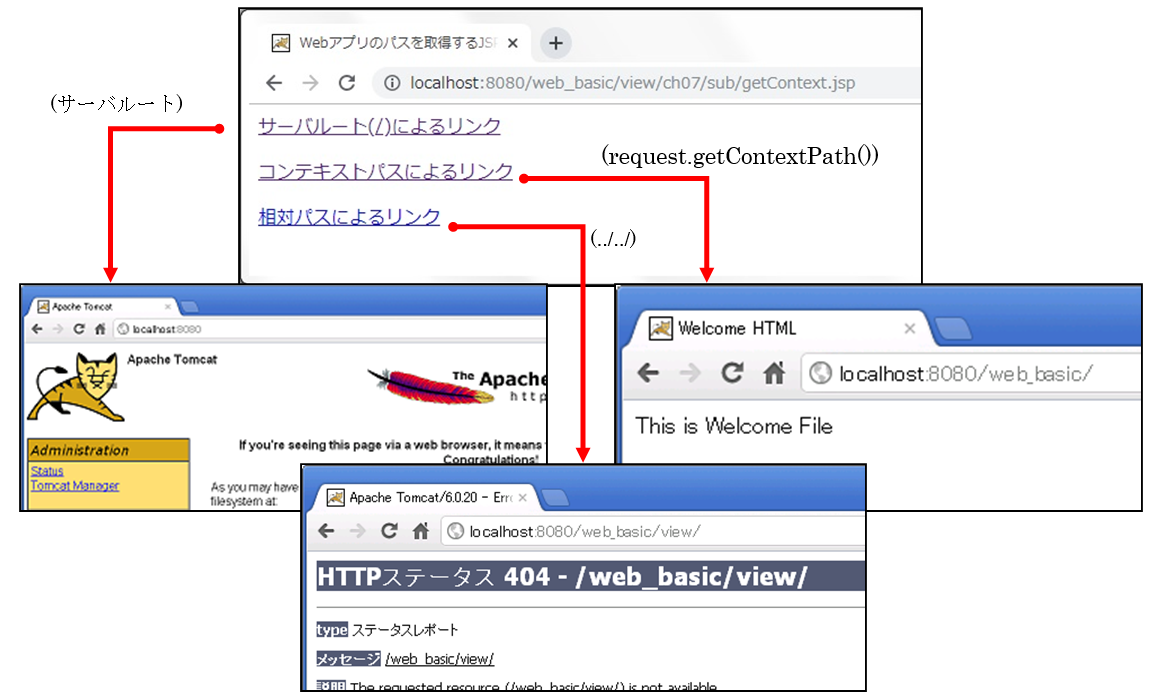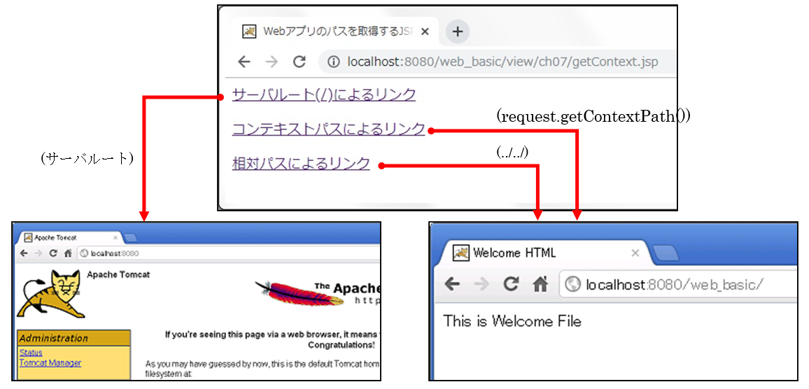 このプログラムでは、リンク先のパスに「/(スラッシュ)」のみを記述した場合に対応するURLと、request.getContextPath()メソッドで取得できる文字列、及びその対応するURLがどのようになっているかが重要です。