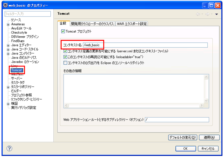 では、web_basicプロジェクトのコンテキストパスの設定を見てみましょう。