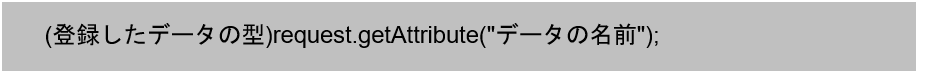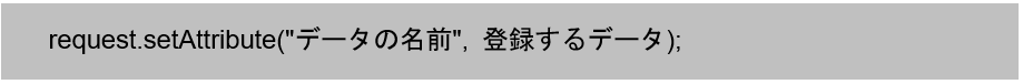 HttpServletRequestインタフェースのオブジェクトに用意されたsetAttribute()メソッドを利用することで、リクエストスコープへデータを登録することができます。メソッドの引数には、登録するデータの名前と登録するデータを渡します。次は、リクエストスコープからデータを取得する書式です。