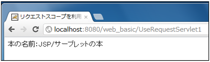 [html] <%@page contentType= “text/html; charset=UTF-8” %> <% //リクエストスコープからのデータの取得 String bookTitle = (String)request.getAttribute(“bookTitle”); %> <html> <head> <title>リクエストスコープを利用したプログラム</title> </head> <body> 本の名前:<%= bookTitle %> </body> </html> [/html]