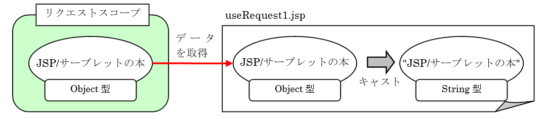 setAttribute()メソッドによってリクエストスコープ内に登録される際に、String型の文字列「JSP/サーブレットの本」はObject型に自動型変換されて登録されます。