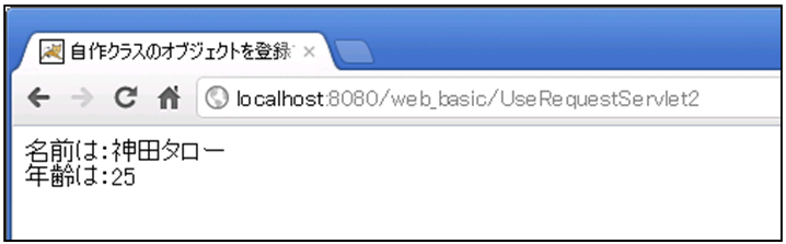 実行結果からも分かるように、サーブレット内でリクエストスコープに登録した自作クラスのオブジェクトをJSPで取得し、オブジェクト内のデータを表示することができます。このように、既存のクラス型以外にも自分で作成したクラスのオブジェクトを扱うことも可能です。