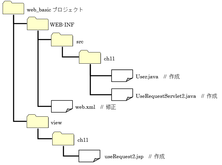 [html] package ch11; import java.io.*; import javax.servlet.*; import javax.servlet.http.*; public class UseRequestServlet2 extends HttpServlet { public void doGet(HttpServletRequest request, HttpServletResponse response) throws ServletException, IOException { //Userオブジェクトの生成 User objUser = new User(); objUser.setName(“神田タロー”); objUser.setAge(25); //リクエストスコープへのUserオブジェクトの登録 request.setAttribute(“RequestUser”, objUser); request.getRequestDispatcher(“/view/ch11/useRequest2.jsp”).forward(request, response); } } [/html] ➢ web.xml