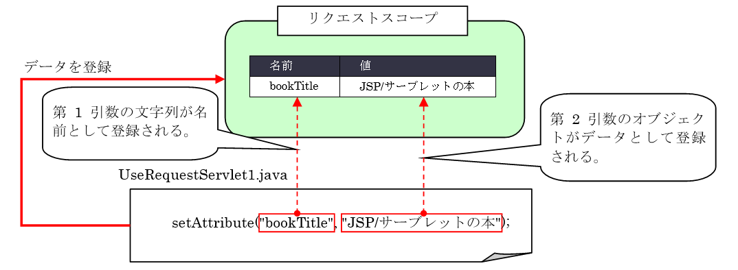 このプログラムは、サーブレット内の13行目でsetAttribute()メソッドを利用し、リクエストスコープにデータを登録しています。setAttribute()メソッドの第1引数に「bookTitle」という文字列を渡しています。この第1引数が、登録するデータの名前になります。また、第2引数には「JSP/サーブレットの本」という文字列を渡しています。この文字列が、実際にリクエストスコープに登録されるデータです。