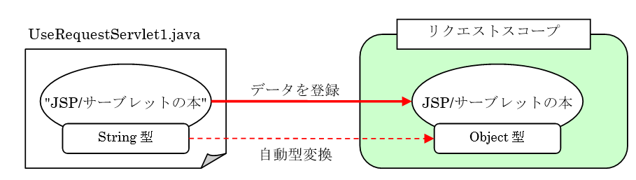 setAttribute()メソッドによってリクエストスコープ内に登録される際に、String型の文字列「JSP/サーブレットの本」はObject型に自動型変換されて登録されます。