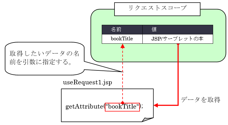 getAttribute()メソッドの引数に「bookTitle」という文字列を渡しています。この引数の文字列がリクエストスコープから取得するデータの名前になります。