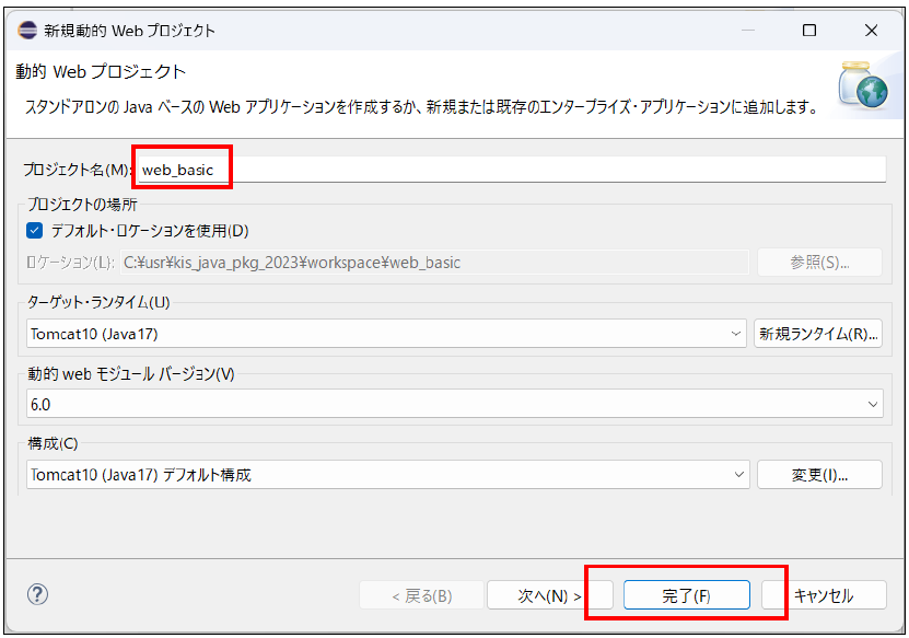 プロジェクト名に「web_basic」と入力し、「完了」ボタンを押下します。