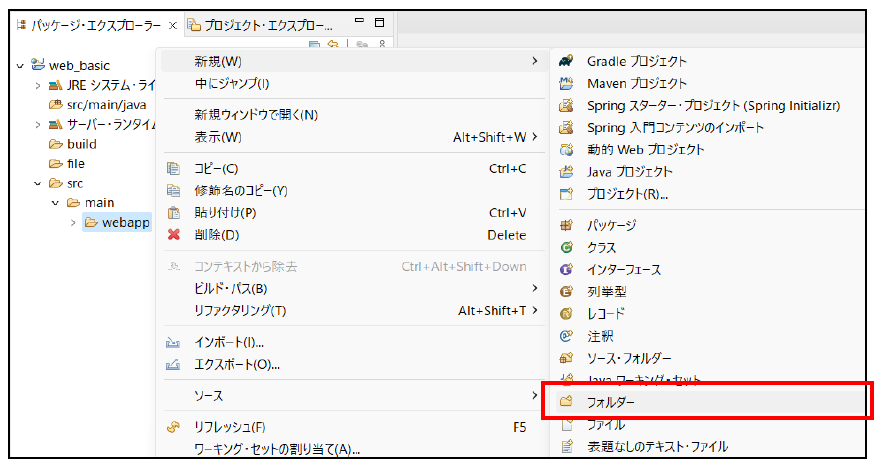 今回は、webappフォルダ直下にフォルダを作成するため、webappフォルダを右クリックします。