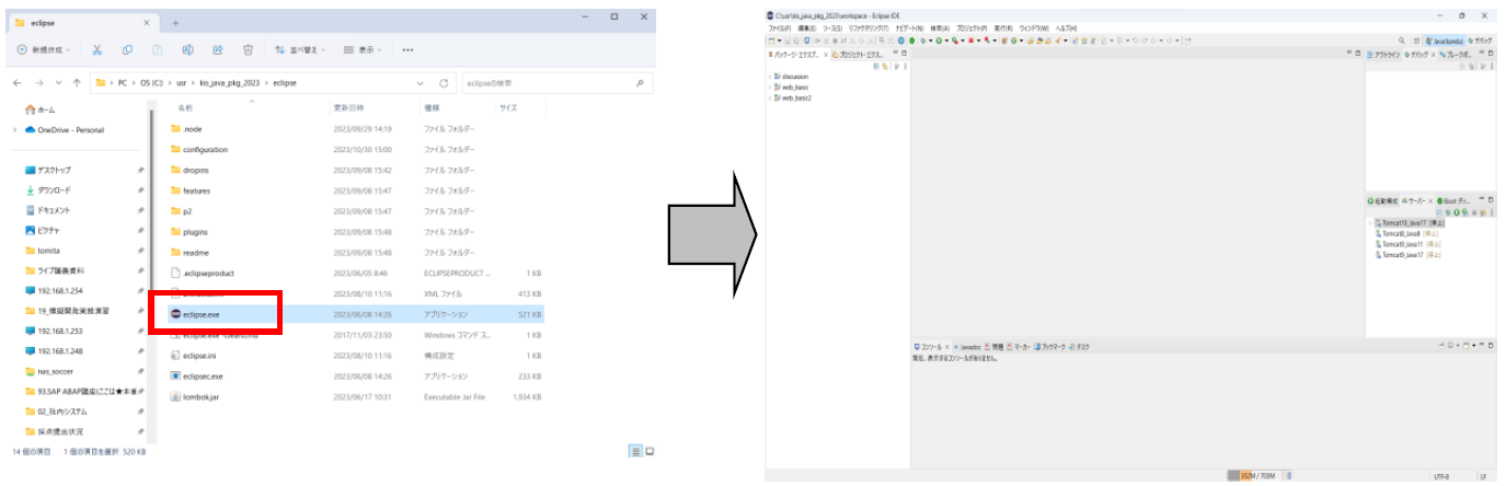 「C:\usr\kis_java_pkg_2023\eclipse」フォルダ内の「eclipse.exe」をダブルクリックしてEclipseを起動します。