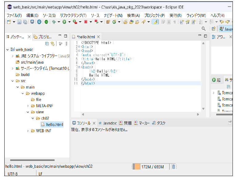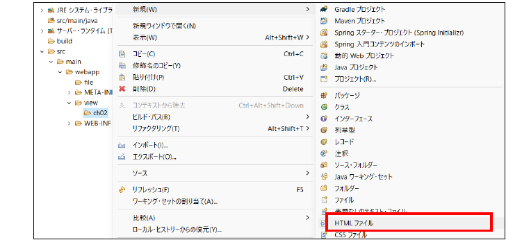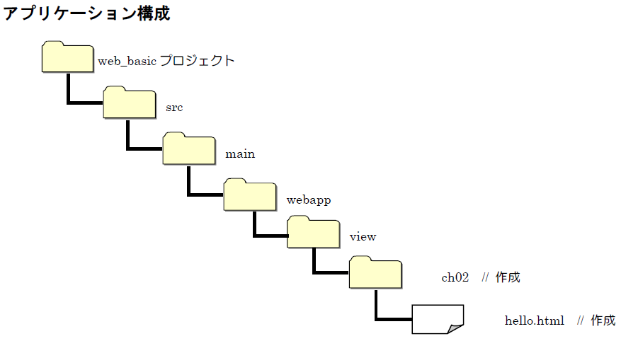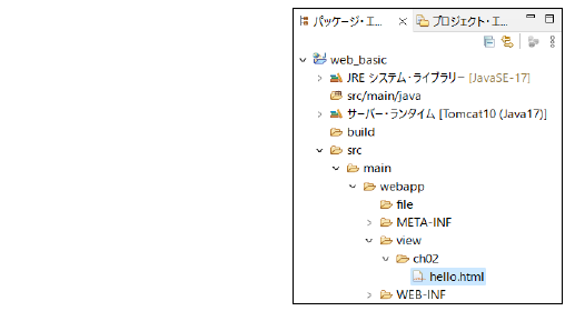 ここではまだ、サーブレットやJSPは使用せずに、HTMLを使って簡単なメッセージを表示するアプリケーションを作成します。本テキストで作成するアプリケーションは、viewフォルダやsrcフォルダ内に各章のサブフォルダを作成し、その中に配置します。