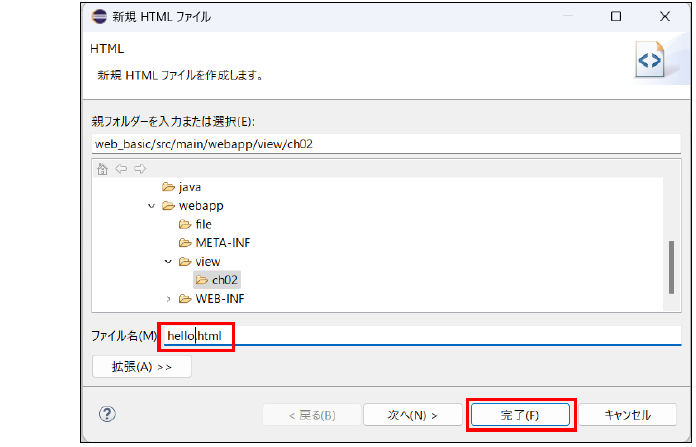 表示された新規ファイル作成画面のファイル名に「hello.html」と入力し、「完了」ボタンを押下します。