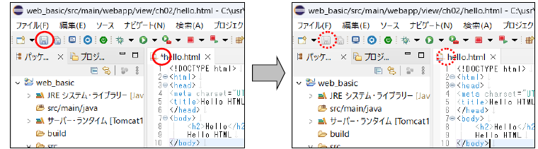 パッケージ・エクスプローラー内の「ch02」フォルダの中に「hello.html」ファイルが作成されます。