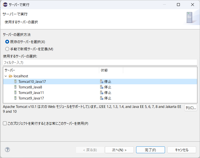 「Tomcat10_Java17」を選択し、「完了」を押下してください。