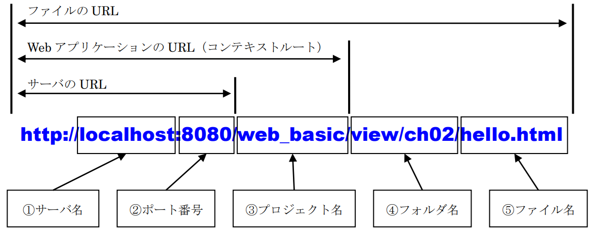 前項で作成した「hello.html」プログラムは、ブラウザでURLを指定し実行しました。プログラムを表示する際のURLは、次のような構成になっています。