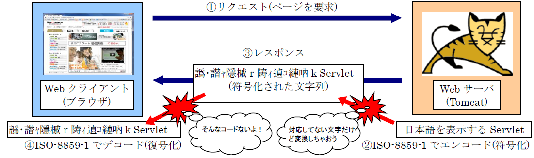 サーブレットでは、文字コードが設定されていない場合、デフォルト文字コードの「ISO-8859-1(Latin1)」が設定されているものとして画面の出力が行われます。「ISO-8859-1(Latin1)」は西欧系の言語ですので、日本語に対応していません。その結果、日本語の部分が「譌・譛ャ隱槭r陦ィ遉コ縺吶k」と表示されてしまいます。