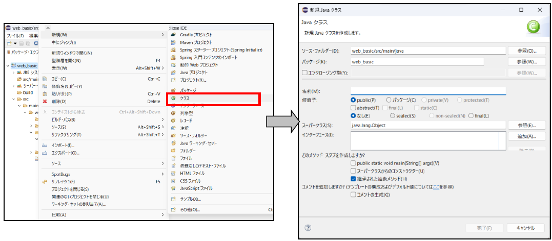 「web_basic」プロジェクトを右クリック > 新規 > クラス を選択すると作成ウィザードが起動します。このウィザードの起動は通常のJavaクラスの作成と変わりません。