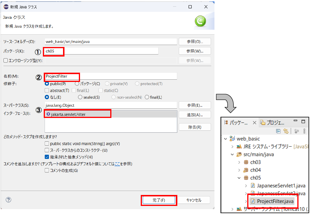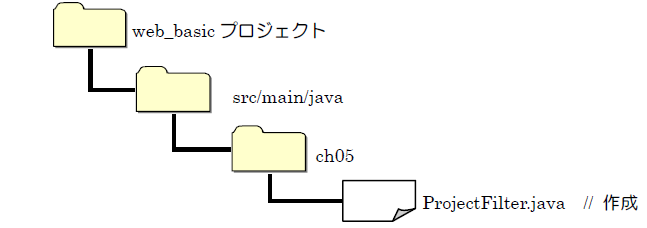 フィルターとなるJavaファイルは「src/main/java」配下に格納します。今回は先程作った「ch05」フォルダ内に配置します。通常のJavaファイルの作成方法とは少し異なる点がありますので、以下の手順を参考にして、「ProjectFilter.java」ファイルを作成してください。
