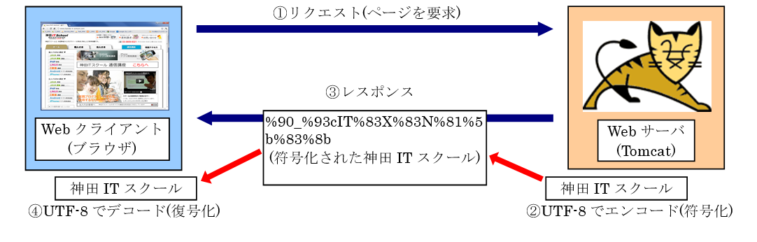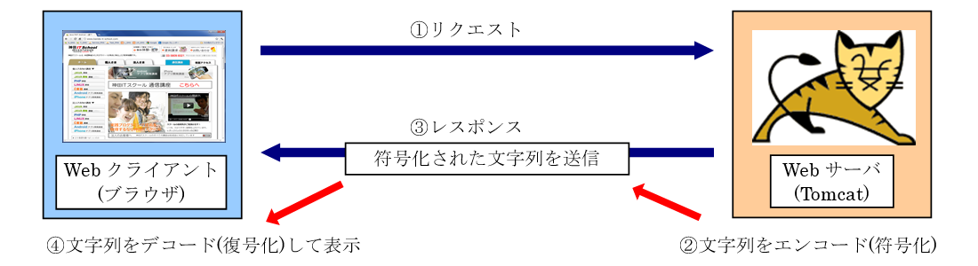 サーブレットからブラウザに文字列を送る場合、Webサーバでエンコード(符号化)と呼ばれる処理が行われ、データがブラウザに送られます。また、ブラウザではデコード(復号化)と呼ばれる処理を行い画面に表示します。
