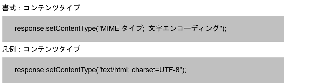 このコンテンツタイプを設定するsetContentType()メソッドの引数には「MIMEタイプ」と「文字エンコーディング」を指定することができます。