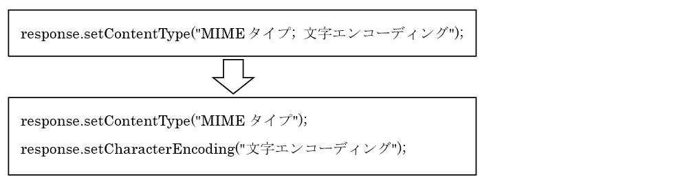 本テキストではsetContentType()メソッドにMIMEタイプと文字エンコーディングを一緒に指定していますが、別々に記述することも可能です。その場合は、setContentType()メソッドの他に、setCharacterEncoding()メソッドもあわせて記述します。