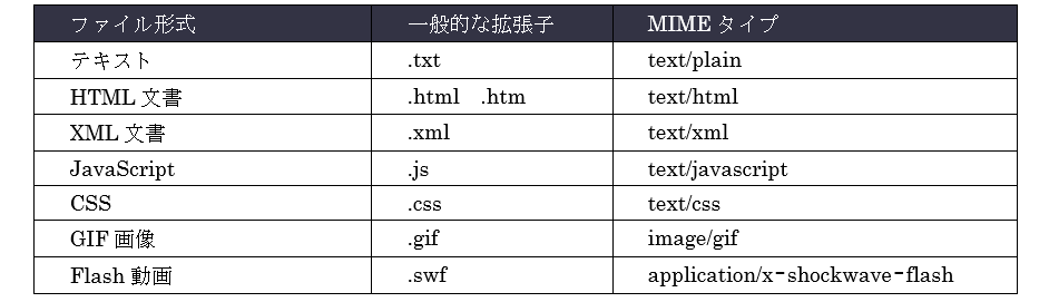 MIMEタイプとは、インターネット上でのデータの種類のことを表すもので、主なMIMEタイプには以下通りです。