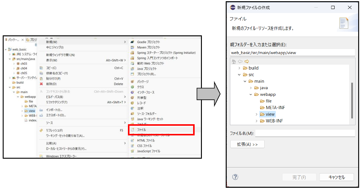 JSPファイルの作成は、「新規ファイル作成ウィザード」を利用します。JSPファイルはサーブレットとは異なり、Webブラウザから直接アクセスします。そのため、JSPファイルは、「src/main/java」フォルダの中ではなく「src/main/webapp」階層に作成した「view」フォルダ内に章のフォルダを作成し、その中に配置します。