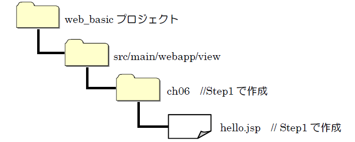 このHello JSP!プログラムでは以下のような構成でプログラムを作成します。