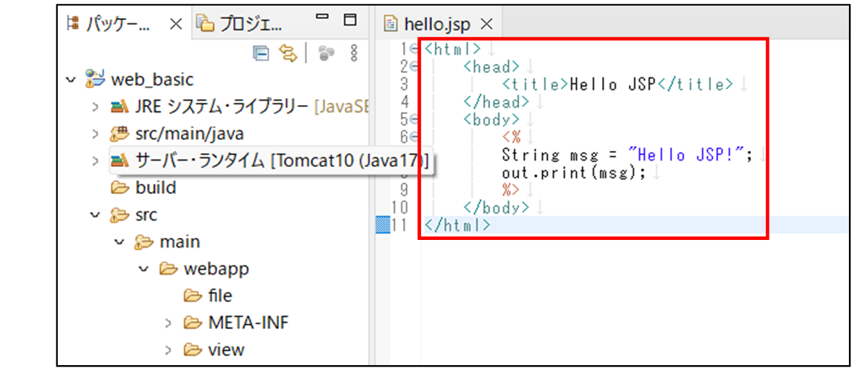 Step1で作成した「hello.jsp」ファイルに以下のソースコードを記述します。
