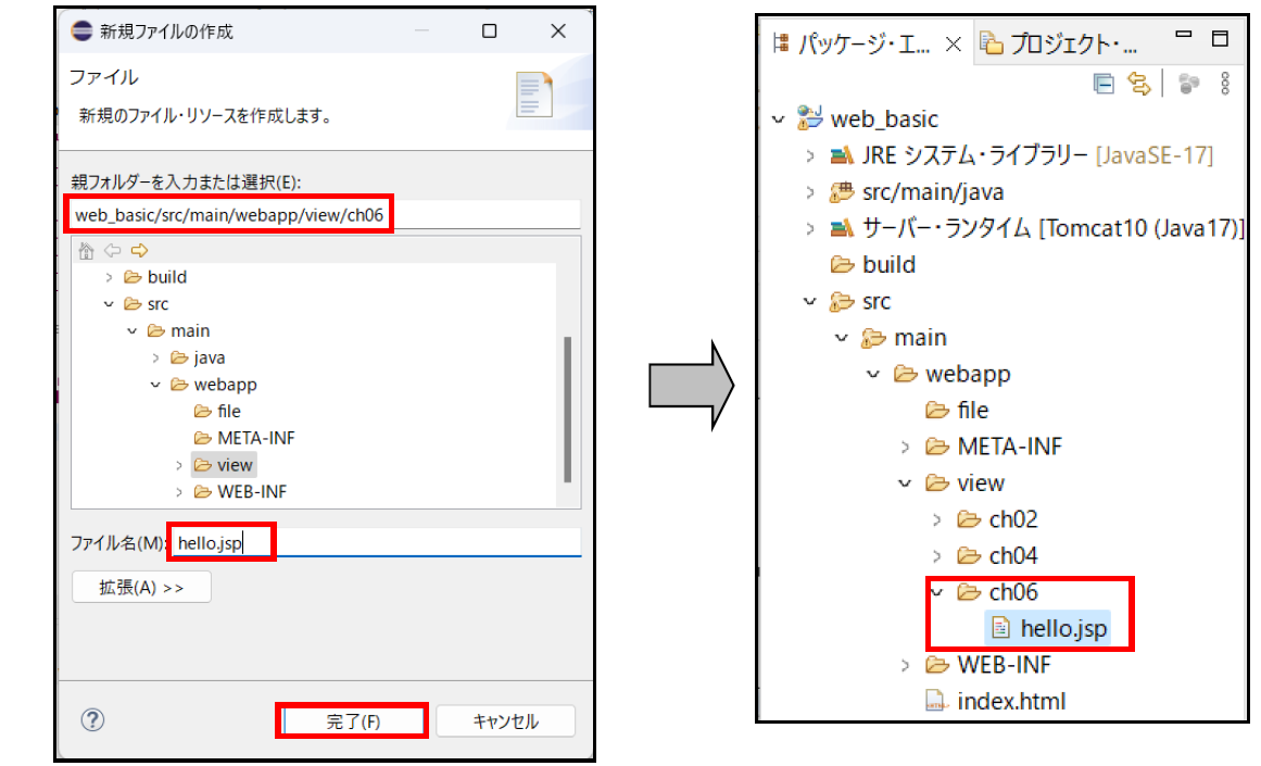 表示された新規フォルダ作成画面の「親フォルダの入力または選択」に「web_basic/src/main/webapp/view/ch06」、ファイル名に「hello.jsp」と入力し、「完了」ボタンを押下します。パッケージ・エクスプローラの構成が下図のようになれば作成は完了です。