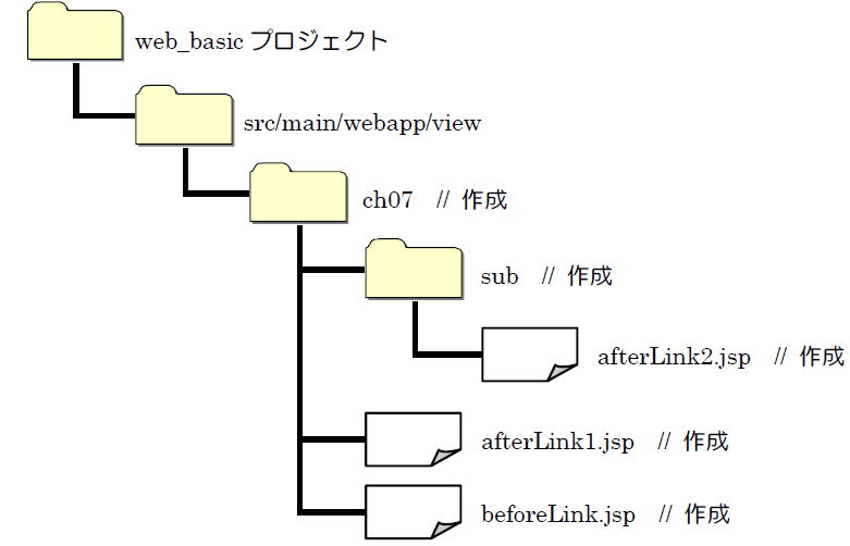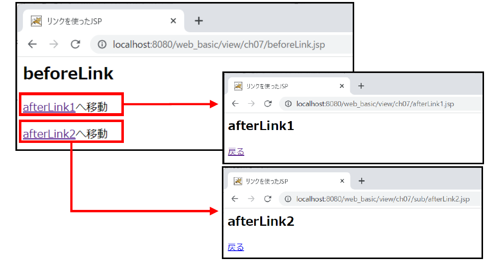③ アクセスURL :http://localhost:8080/web_basic/view/ch07/beforeLink.jsp