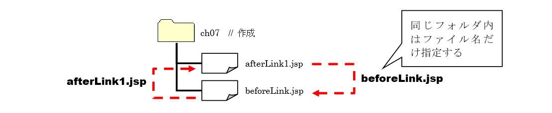 beforeLink.jspから見た場合、afterLink1.jspは同じファイルの中にあります。このような場合は、ファイル名のみを記述します。