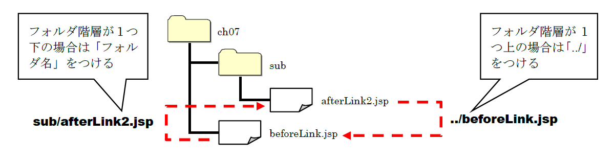 このプログラムでは、相対パスを使ってパスを指定しています。beforeLink.jspファイルから見て、表示したいファイルがある場所によってパスの指定方法が異なります。