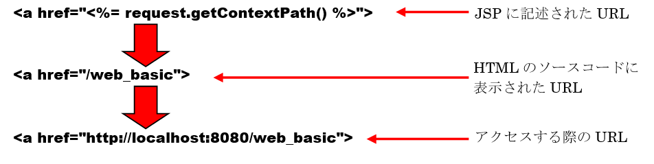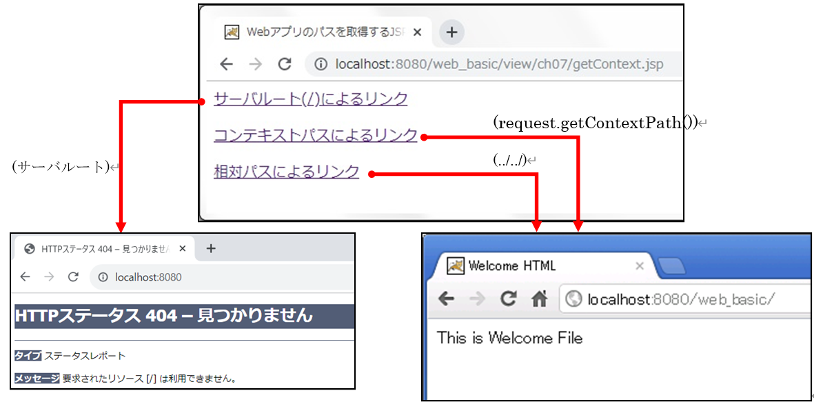 このプログラムでは、リンク先のパスに「/(スラッシュ)」のみを記述した場合に対応するURLと、request.getContextPath()メソッドで取得できる文字列、及びその対応するURLがどのようになっているかが重要です。