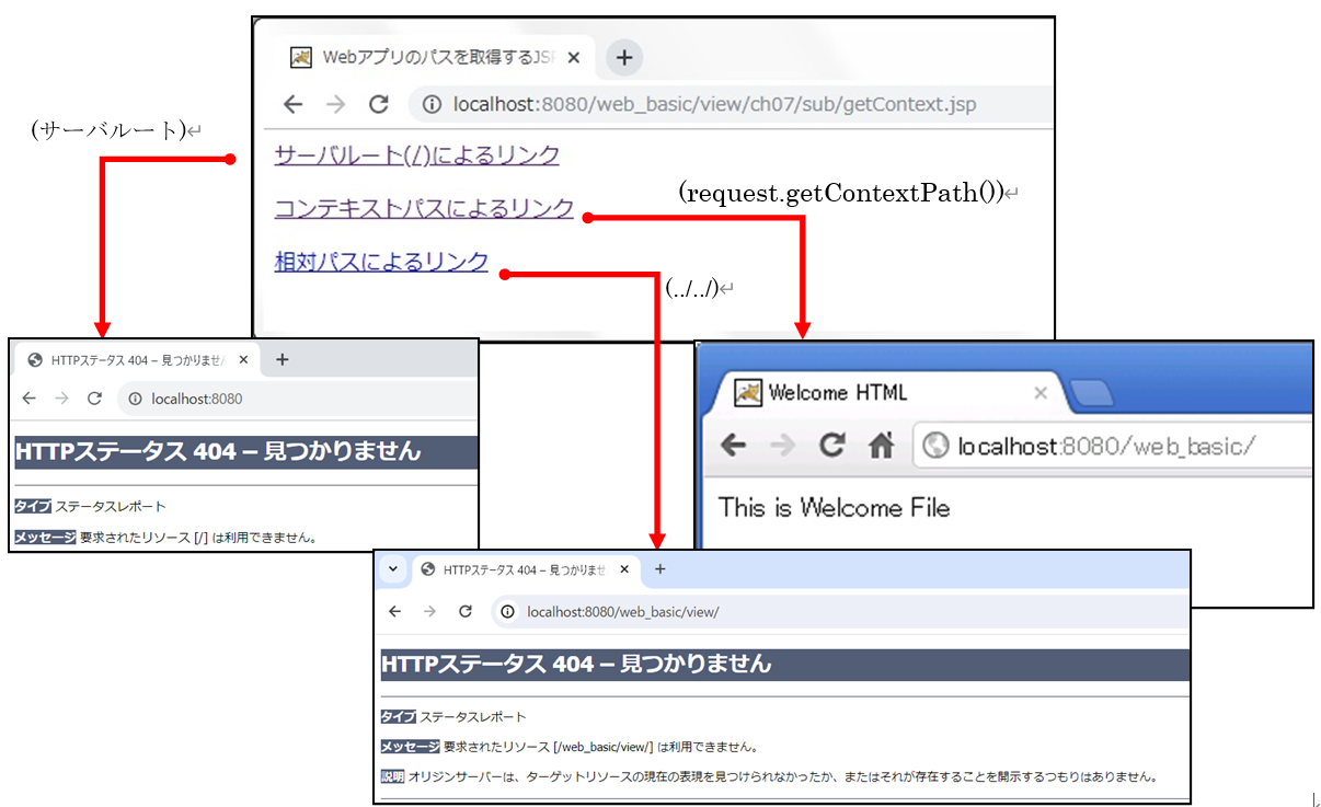 このように、呼び出し元のファイルの位置は気にせずに、サーバのルートから相対パスを指定することができるので、Webアプリケーションのパスの指定には、request.getContextPath()メソッドがよく利用されます。