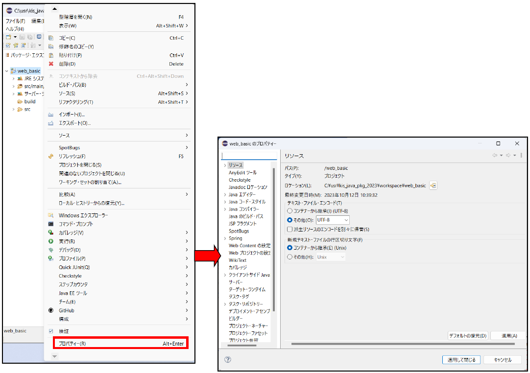 web_basicプロジェクトを右クリックし、表示された一覧の中から「プロパティ」を選択します。するとweb_basicのプロパティ画面が表示されます。