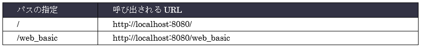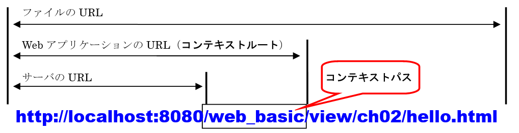 Webサーバは、Webアプリケーションをコンテキストと呼ばれる単位で管理しており、WebアプリケーションのURLのことをコンテキストルートとも呼びます。また、Webサーバから見たコンテキストルートまでのパスのことをコンテキストパスと呼びます。上記の図のURLでは「/web_basic」の部分がコンテキストパスとなっており、Tomcatの設定がデフォルトの状態のときは、Webアプリケーションのプロジェクト名の頭に「/」(スラッシュ)を付けたパスとなります。