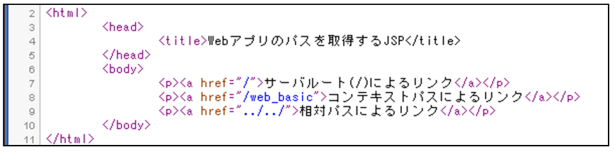 [html] <%@page contentType= “text/html; charset=UTF-8″ %> <html> <head> <title>Webアプリのパスを取得するJSP</title> </head> <body> <p><a href=”/”>サーバルート(/)によるリンク</a></p> <p><a href=”<%= request.getContextPath() %>”>コンテキストパスによるリンク</a></p> <p><a href=”../../”>相対パスによるリンク</a></p> </body> </html> [/html]