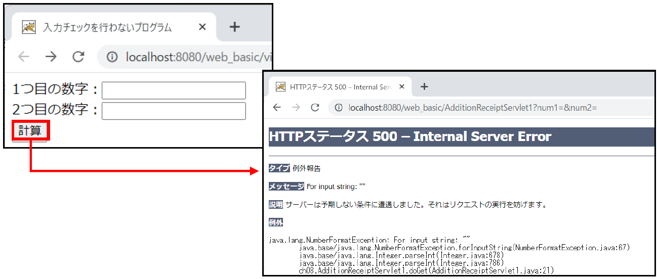 この画面では、「java.lang.NumberFormatException: For input string: “”」と表示されています。テキストボックスは何も入力せずに送信すると「””(空文字)」が入っているものとして扱われるため、int型に変換できないエラーとしてNumberFormatExceptionが発生します。このエラーを回避するためには空白文字のチェックが必要です。