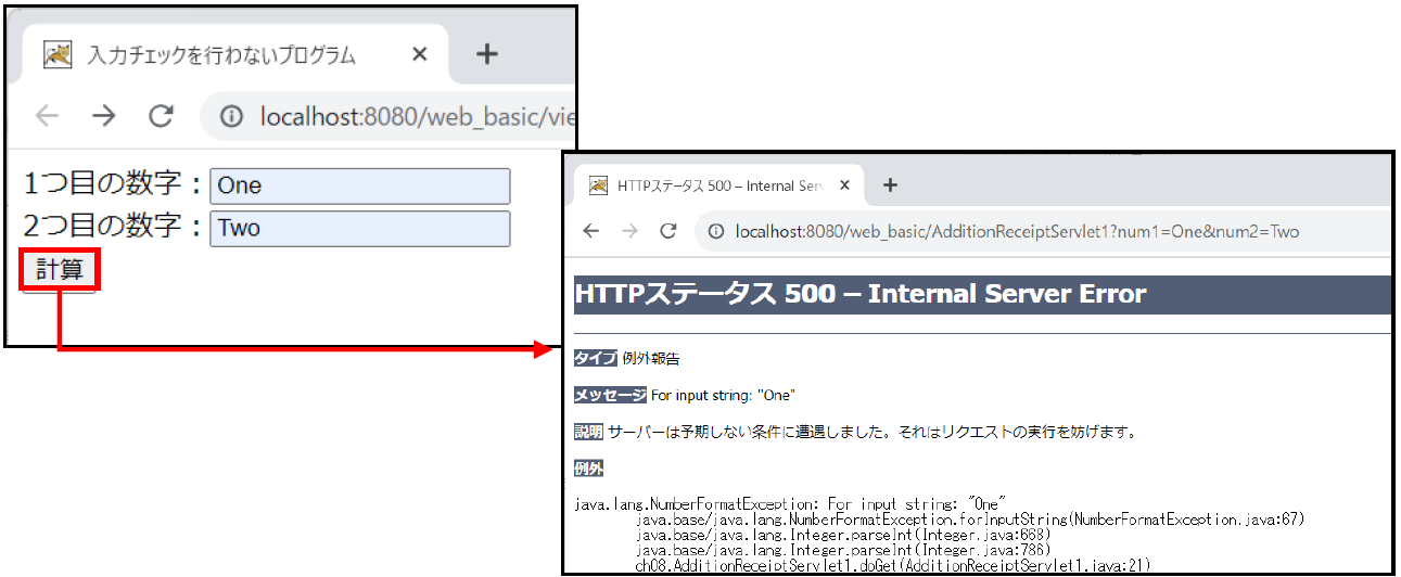 値に文字を入力し計算ボタンを押すと、空白で入力した場合と同じようにint型への変換ができないため、NumberFormatExceptionが発生します。このエラーを回避するためには、入力されたパラメータが数値に変換できるかどうかのチェックが必要です。