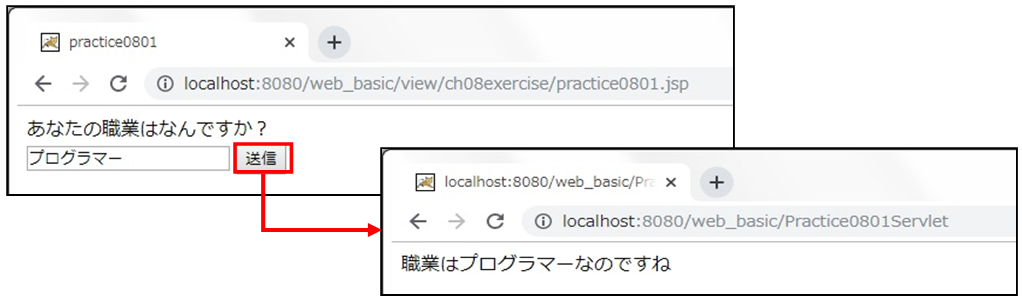 ③ アクセスURL :http://localhost:8080/web_basic/view/ch08exercise/practice0801.jsp