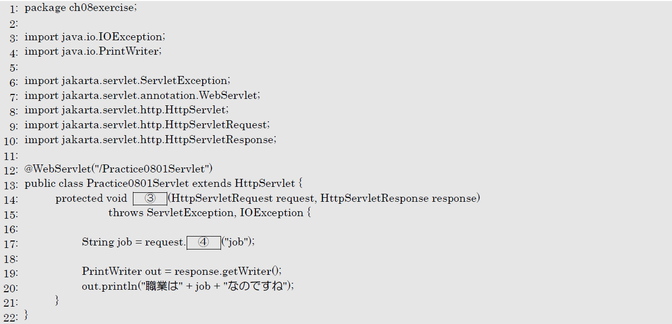 [html] <%@page contentType= “text/html; charset=UTF-8″ %> <html> <head> <title>practice0801</title> </head> <body> <form action=”<%= request.getContextPath() %>/Practice0801Servlet” method=” ① ”> あなたの職業はなんですか?<br> <input type=”text” name=” ② ”> <input type=”submit” value=”送信”> </form> </body> </html> [/html]
