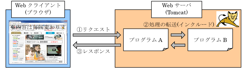 インクルードは転送先のプログラムを実行した後、転送元に戻って画面出力の処理を行います。