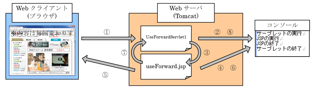 ⑨ UseForwardServletサーブレットの処理が終了します。