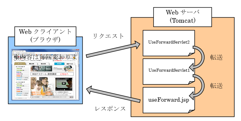 このプログラムではUseForwardServlet2.javaファイルにアクセスしていますが、実際に表示された画面はuseForward.jspファイルで生成された画面になっています。このプログラムの流れは次の図のようになっています。