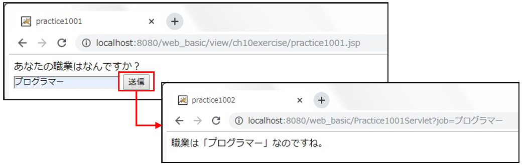 ③ アクセスURL :http://localhost:8080/web_basic/view/ch10exercise/practice1001.jsp