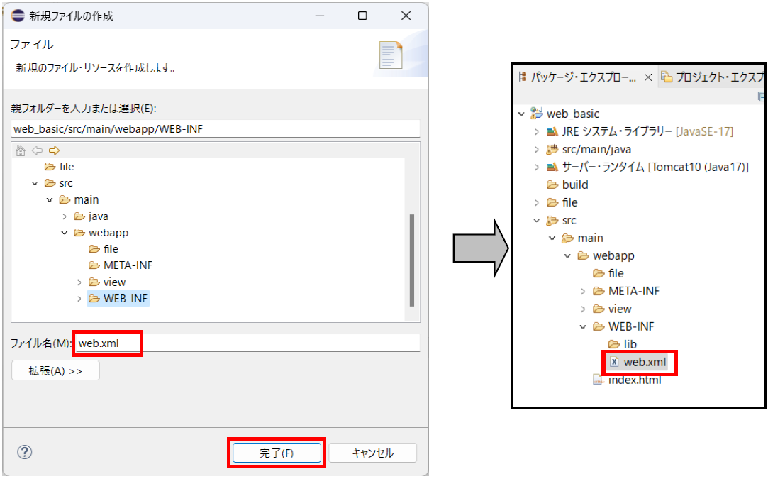 表示された新規フォルダ作成画面のフォルダ名に「web.xml」と入力し、「完了」ボタンを押下します。パッケージ・エクスプローラ内にweb.xmlファイルが増えていれば作成成功です。