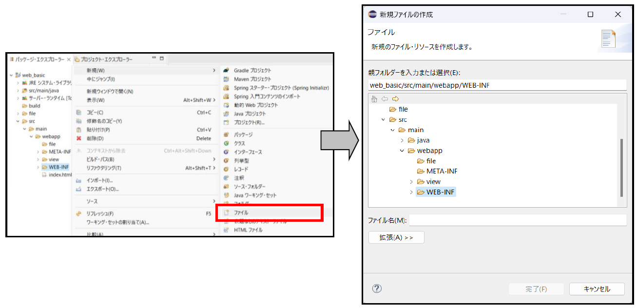 「WEB-INF」フォルダを右クリック > 新規 > ファイル を選択すると作成ウィザードが起動します。