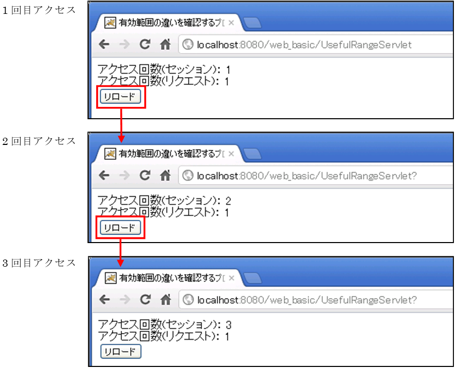 このプログラムは、アクセスされた回数をセッションとリクエストに登録し画面に表示します。リクエストスコープとセッションに登録されたデータが保持されている期間の違いについて確認しましょう。